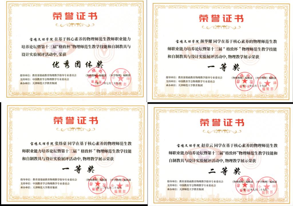 近日,由教育部基础教育物理教学指导专业委员会、《物理教师》编辑部与《中学物理》编辑部共同主办的第十三届“格致杯”全国物理师范生教学技能展评活动在天津师范大学落下帷幕。我校物理与光电技术学院学生获佳绩,其中,颜华耀、张炜豪同学获一等奖,赵章云同学获二等奖,薛慧香、王杰、刘颖等6位同学获三等奖,我校获优秀团体奖。