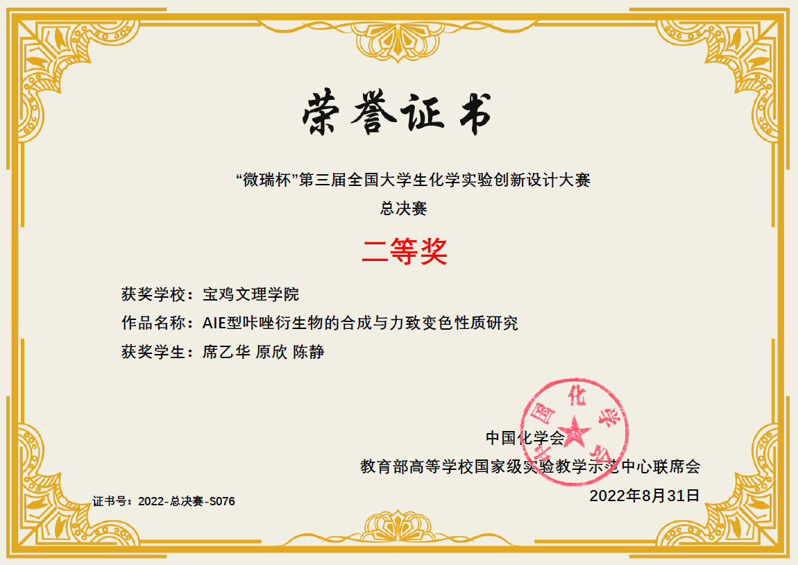 近期,“微瑞杯”第三届全国大学生化学实验创新设计大赛在厦门举行。我校2020级化学专业学生席乙华、原欣、陈静的参赛作品“AIE型咔唑衍生物的合成与力致变色性质研究”(指导老师:陈璞博士、冯海涛教授)获得本届赛事全国二等奖。