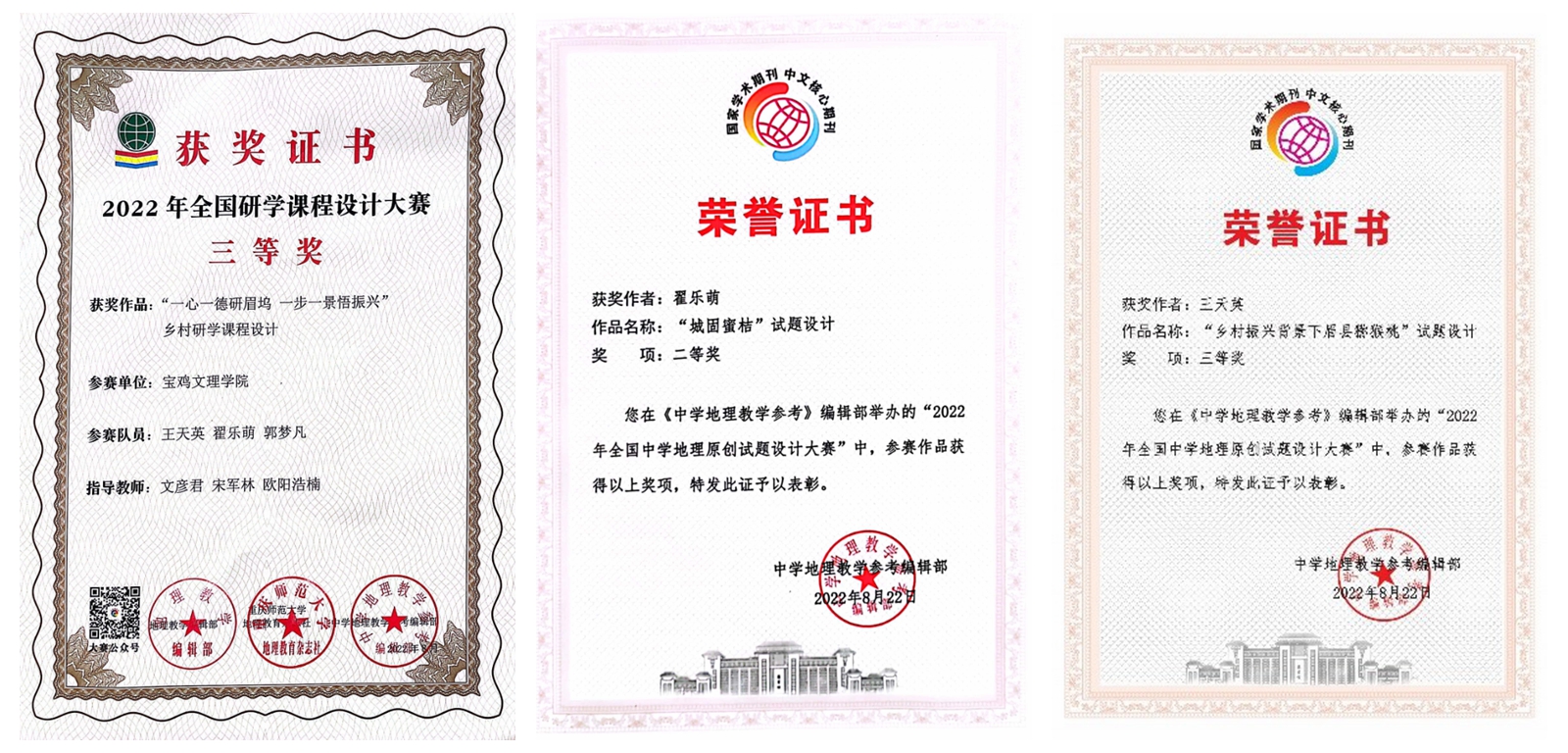 近日,由《中学地理教学参考》《地理教学》《地理教育》三大地理教育类期刊联合举办的‘2022年“九州杯”全国研学课程设计大赛’和由《中学地理教学参考》举办的第二届“全国中学地理原创试题设计大赛”顺利举行。经过前期长时间的精心准备和多个环节的竞赛,我校地理与环境学院2018级本科生郭梦凡和2021级学科教学(地理)研究生王天英、翟乐萌合作设计的《一心一德研眉坞,一步一景悟振兴》研学课程获得三等奖(指导教师:文彦君、宋军林、欧阳浩楠);2021级学科教学(地理)专业硕士翟乐萌获得原创试题设计大赛二等奖(指导教师:靳美娟)、2021级学科教学(地理)专业硕士王天英获得三等奖(指导教师:文彦君)。