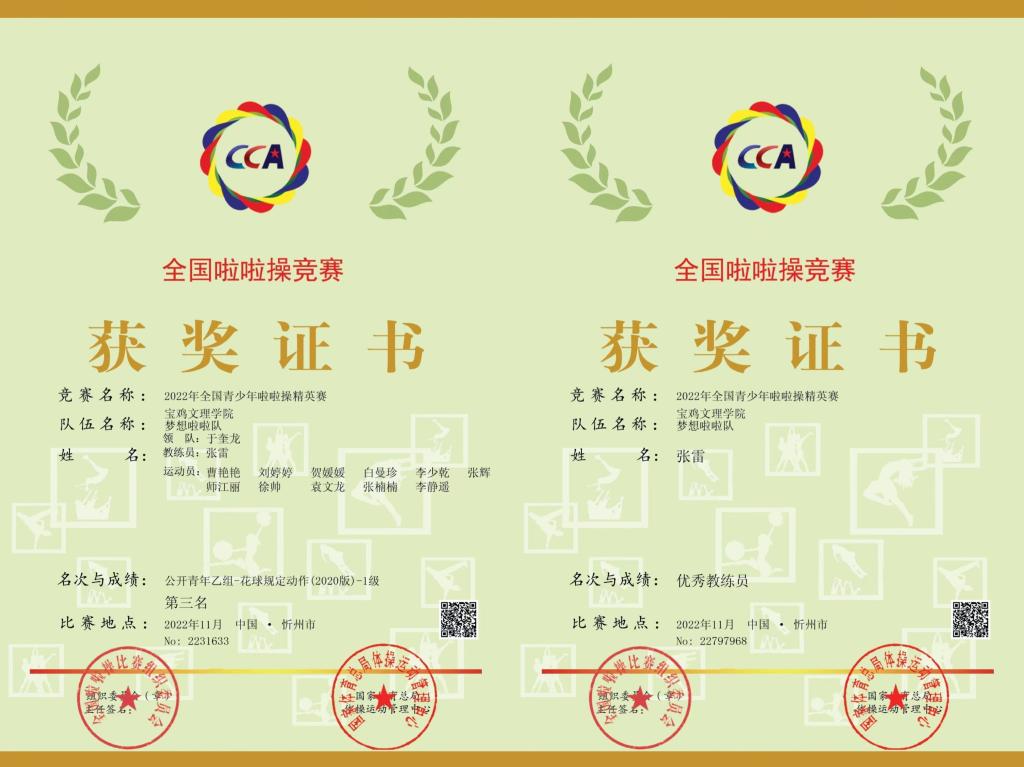 近日,2022年全国青少年啦啦操精英赛落下帷幕,经过激烈的角逐,我校代表队获得了公开青年乙组花球啦啦操第三名的好成绩,体育学院张雷老师获“优秀教练员”荣誉称号。