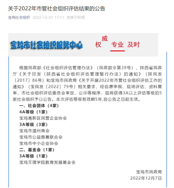 12月7日,宝鸡社会组织微信公众号公布了2022年市管社会组织评估结果,我校教育发展基金会荣获3A等级。