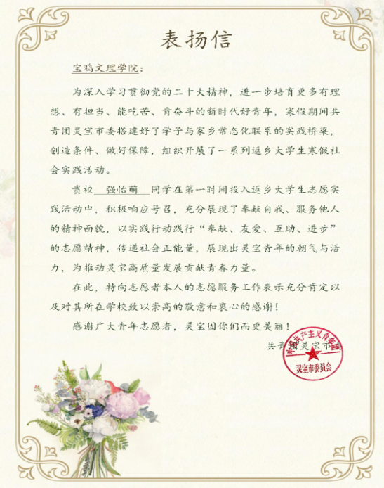 近日,我校收到来自共青团灵宝市委的表扬信,信中肯定和表扬了政法学院2021级学生强怡萌返乡参加志愿服务活动的行为,并对我校致以崇高的敬意和衷心的感谢。