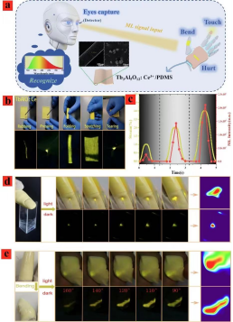 机械发光材料由于具有自恢复、可视化、非接触传感等特性,有望作为光学传感技术的载体,在机械传感领域得到了广泛的研究。然而,温度、湿度、腐蚀性物质等人类生活环境对光学传感材料的影响是不可忽视的,这极大地影响了光学传感的精度。为了克服这些因素精度的障碍,该论文提出了一种基于Ce3+掺杂石榴石结构发光材料Tb3Al5O12的柔性机械发光复合器件,该器件在明暗环境下都具有高亮度的机械发光特性。在反复的机械刺激作用下,机械发光强度表现出良好的自恢复性能,在0 ~ 100°C范围内,机械发光强度表现出零热猝灭性能。此外,论文还对该复合器件在水中不同时间的抗湿性进行了评价,证明其机械发光的强度几乎不受潮湿环境的影响。基于此,该论文提出了一种基于机器人手指弯曲的模拟人类触觉系统的应用。研究结果表明,基于Tb3Al5O12: Ce3+的机械发光复合器件在先进光学多模传感器以及机器人末端触觉传感领域有着一定的应用前景。(研究生院、物理与光电技术学院 文、图/董宇 审核/凡明锦、钱郁)
