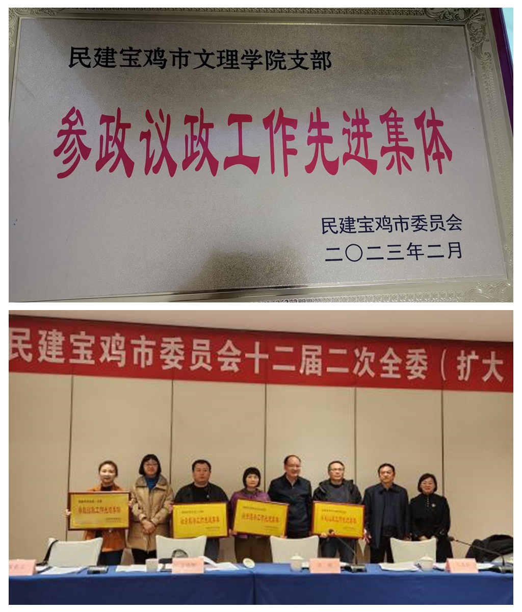 近日,在民建宝鸡市委员会第十二届二次全委(扩大)会议上,宝鸡文理学院支部获“参政议政工作先进集体”荣誉称号;会员陈凯鹏、景红艳、高红艳、王正英分别获“2022年度参政议政工作先进个人”“2022年度新闻宣传工作先进个人”荣誉称号。