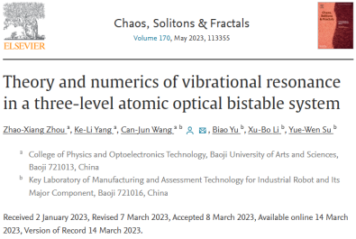近日,我校物理与光电技术学院2020级研究生周兆祥等人完成的研究工作“Theory and numerics of vibrational resonance in a three-level atomic optical bistable system”在国际著名期刊Chaos, Solitons & Fractals上发表。该期刊是由Elsevier出版,涵盖了非线性科学、非平衡和复杂现象等跨学科领域,为中科院1区Top期刊,最新影响因子为9.92。周兆祥同学为论文第一作者,导师王参军教授为通讯作者,我校为该论文第一完成单位及通讯单位。