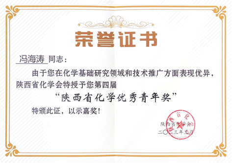 近日,2023年陕西省化学会理事会在西北农林科技大学召开。我校化学化工学院冯海涛教授荣获陕西省化学优秀青年奖。