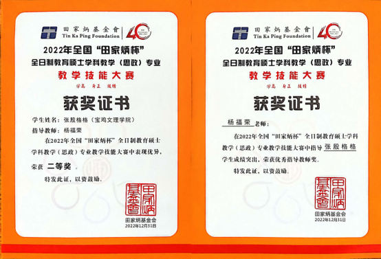 近日,2022年全国“田家炳杯”全日制教育硕士专业学位研究生学科教学(思政)专业教学技能大赛在沈阳师范大学落下帷幕,我校政法学院2021级学科教学(思政)专业研究生张殷格格获全国总决赛二等奖,政法学院杨福荣老师获优秀指导教师奖。