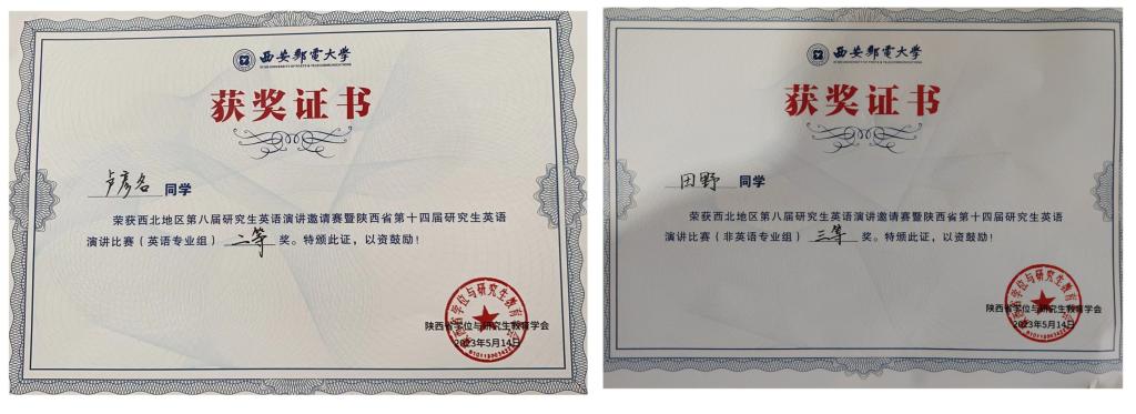 5月14日,西北地区第八届研究生英语演讲邀请赛暨第十四届研究生英语演讲比赛在西安邮电大学落下帷幕,我校外国语学院研究生卢彦名、音乐学院研究生田野分别荣获专业组二等奖和非专业组三等奖,外国语学院王盈盈、黄龙飞作为卢彦名的指导老师,鱼为全、吴梅梅作为田野的指导老师获优秀指导教师奖。