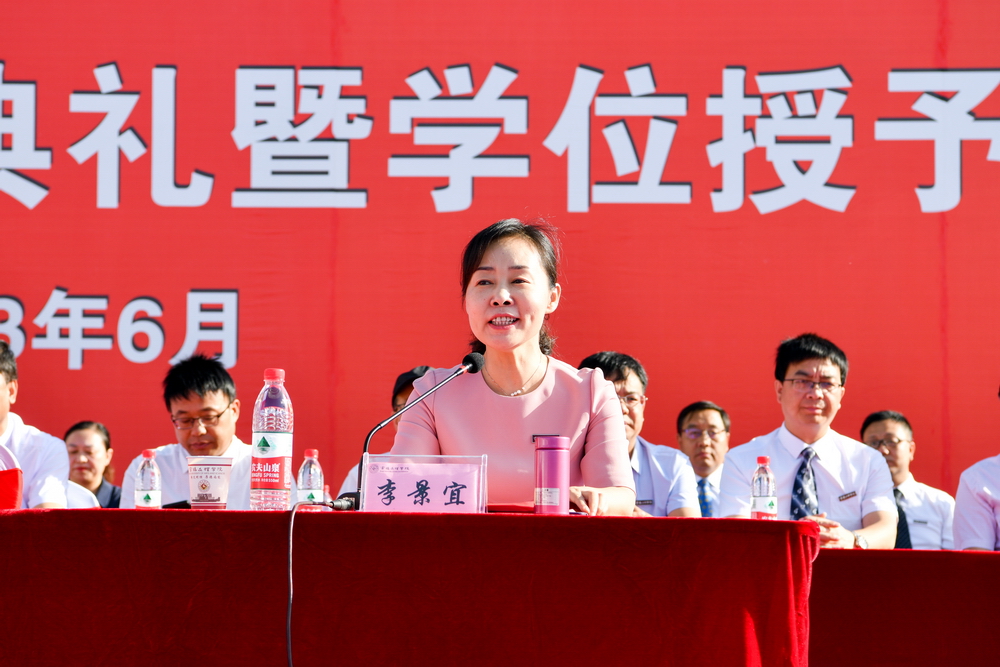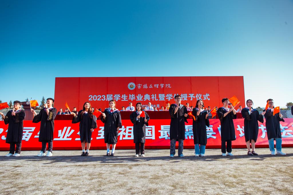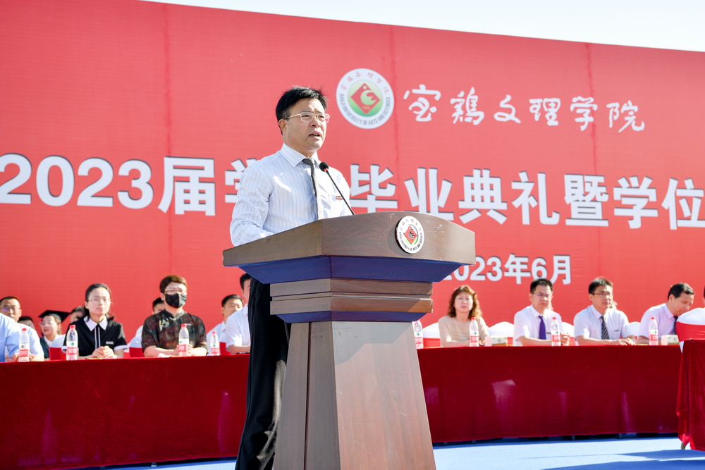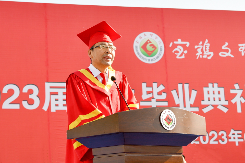 郭霄鹏指出,同学们在学校的几年里,始终与时代同歌、与梦想为伴,团结一心、坚毅刚强,刻苦学习、积极进取,勇于创新、追求卓越,无私奉献、热心公益,心系国家、感恩社会,以校为荣、爱校如家,克服疫情带来的不利影响,不负青春与梦想,用奋进之笔绘就了青春的五光十色,书写了属于自己的华彩篇章。他感谢同学们为学校发展作出的重要贡献。他向同学们提出三点希望:一是志存高远,矢志报国。希望同学们按照习近平总书记“立足新时代新征程,中国青年的奋斗目标和前行方向归结到一点,就是坚定不移听党话、跟党走,努力成长为堪当民族复兴重任的时代新人”的要求,以实现中华民族伟大复兴为己任,把个人成才与社会需要、人民幸福结合起来,把个人奋斗与国家富强、民族复兴结合起来,用脚步丈量祖国大地,用眼睛发现中国精神,用耳朵倾听人民呼声,用内心感应时代脉搏,用“中国梦”的宏伟目标指引人生航向,把宝文理精神内化于心、外化于行,为自己代言,为青春代言,为母校代言,在赓续中国梦的伟大实践中创造属于自己的胜利和荣光。二是坚韧不拔,砥砺奋斗。希望同学们牢记习近平总书记“明天的中国,希望寄予青年。青年兴则国家兴,中国发展要靠广大青年挺膺担当”的嘱托,勇担奋斗使命,激扬奋斗热情,拓展奋斗路径,保持定力、恪守初心、百折不挠,勇做只争朝夕的行动者和脚踏实地的奋斗者,在乘风破浪中开拓前进,在披荆斩棘中开辟天地,在攻坚克难中创造业绩,努力书写无愧于时代的人生华章。三是力学不倦,增长才干。希望同学们牢记习近平总书记“梦想从学习开始、事业靠本领成就”的教诲,拥抱时代之潮,适应时代之变,时刻保持求知的热情,养成和坚守终身学习的习惯,把学习作为穷其终生的首要任务,作为一种责任、一种精神追求、一种生活方式,持续不断地提升专业能力和认知水平、拓展认知边界和思维格局,让勤奋学习成为青春远航的动力,让增长本领成为青春搏击的能量,更好地用自己的聪明才智为国争光、为民造福。他祝愿广大毕业生此去花开成海、一路芬芳,前程似锦、一生幸福!