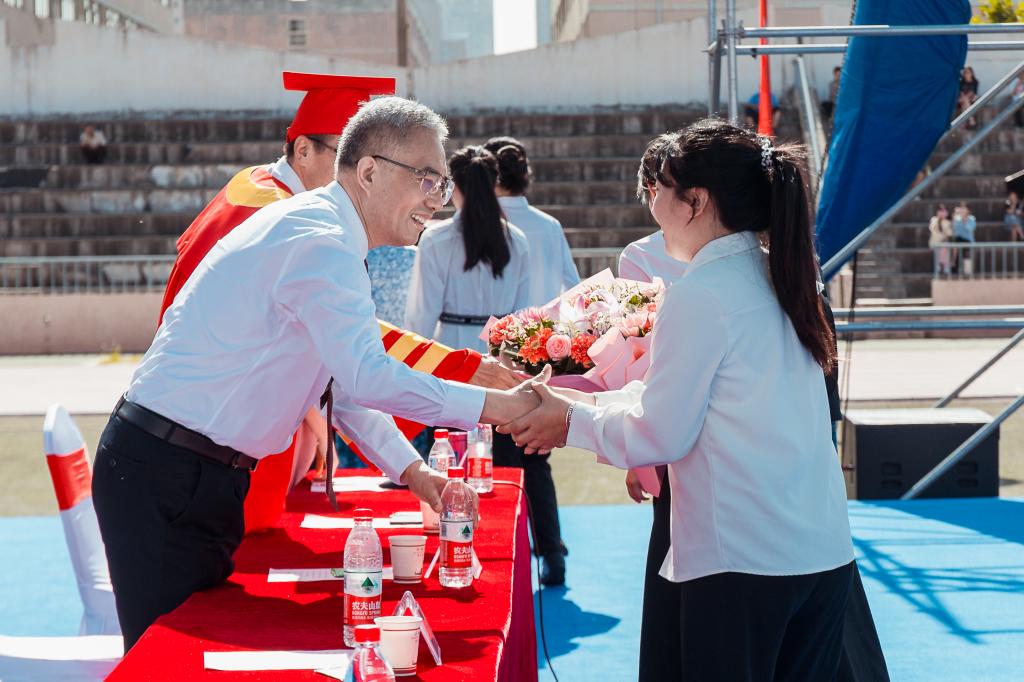 韩干校宣读了2023届毕业资格审查结果、学位授予决定和优秀毕业生表彰决定。学校党政领导为省级优秀毕业生、优秀学生干部、校级优秀毕业生代表颁发荣誉证书,为“‘秦岭才俊’博士奖、硕士奖”获奖学生代表颁发荣誉证书和奖金,为西部计划志愿者佩戴绶带。毕业生代表为教师代表和家长代表献花,表达了对学校、老师辛勤培育的感激之情及对父母养育的感恩情意。