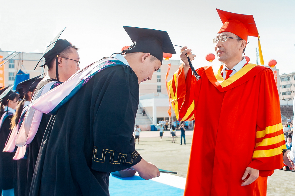 郭霄鹏为硕士学位获得者、学士学位获得者代表扶正流苏并颁授学位证书。