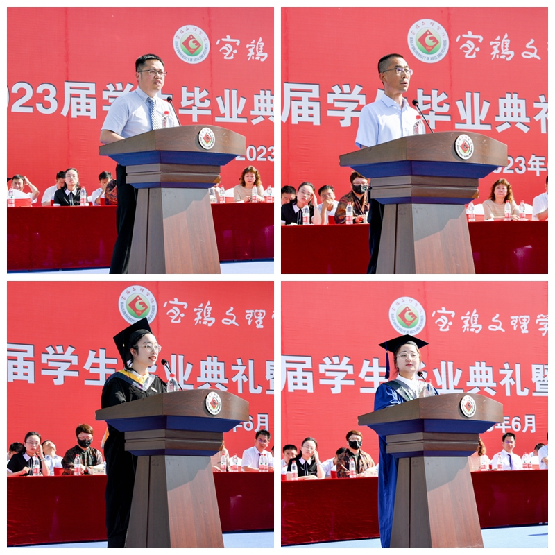 机械工程学院李亮博士代表全体教师向即将开启人生新篇章的2023届毕业生致以最诚挚的祝贺和最衷心的祝福。毕业生家长代表汤永刚先生向顺利完成学业的毕业生表示祝贺,向为培育孩子们成长尽心竭力的全体教职员工表示最诚挚的感谢,并叮嘱同学们要牢记母校、牢记恩师、牢记同学,朝着新的目标,砥砺前行、勇敢拼搏。电子电气工程学院本科毕业生戴于茜、化学化工学院硕士毕业生李皓琳分别代表全体毕业生向辛勤培养他们的领导和老师致以最崇高的敬意,向操劳的父母表示最衷心的感谢,向朝夕相处的同学们送上最真诚的祝福,愿母校六十五岁生日快乐,事业蒸蒸日上,再创新的辉煌。