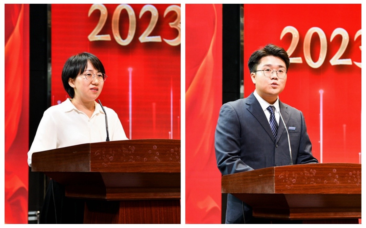 2021-2023学年校级“优秀教师”、马克思学院教师杨蕾在发言中分享了自己从教以来成长的“三心”:对职业的敬畏之心、对学生的博爱之心、对学校的感恩之心,并代表全体教师表示,秉承学校“博文明理厚德尚能”的校训,为学校创建高水平大学积极贡献力量。