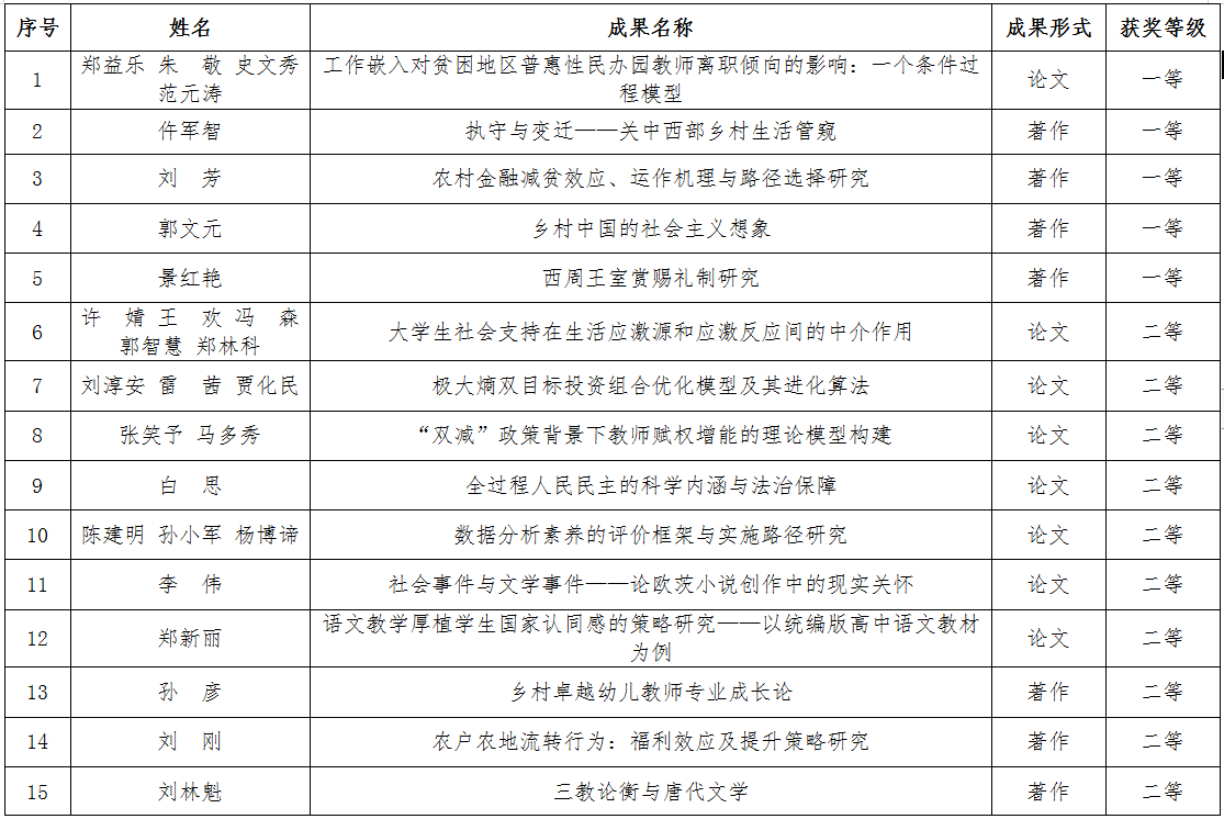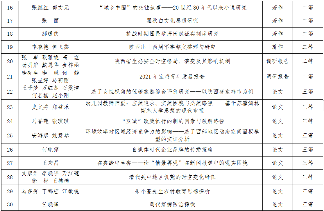 近日,宝鸡市人民政府公布了宝鸡市第十七次哲学社会科学优秀成果奖获奖名单,我校获奖44项,其中,一等奖5项(论文1项、著作4项),二等奖16项(论文7项、著作7项、调研报告2项),三等奖23项(论文15项、著作4项、调研报告4项)。(科研管理处 文/周瑜 审核/王晓玲)