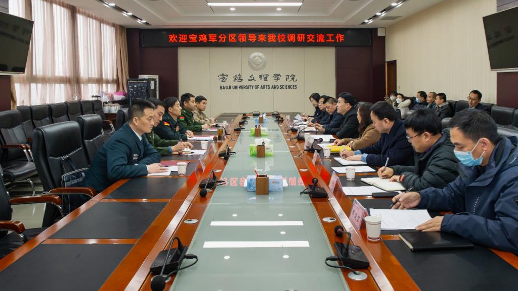 1月16日,宝鸡军分区司令员宋军政来我校调研指导大学生征兵工作。校党委书记赵健、校长郭霄鹏会见宋军政并进行了交流。党委副书记韩干校出席座谈会。会议由党政办主任王永君主持。