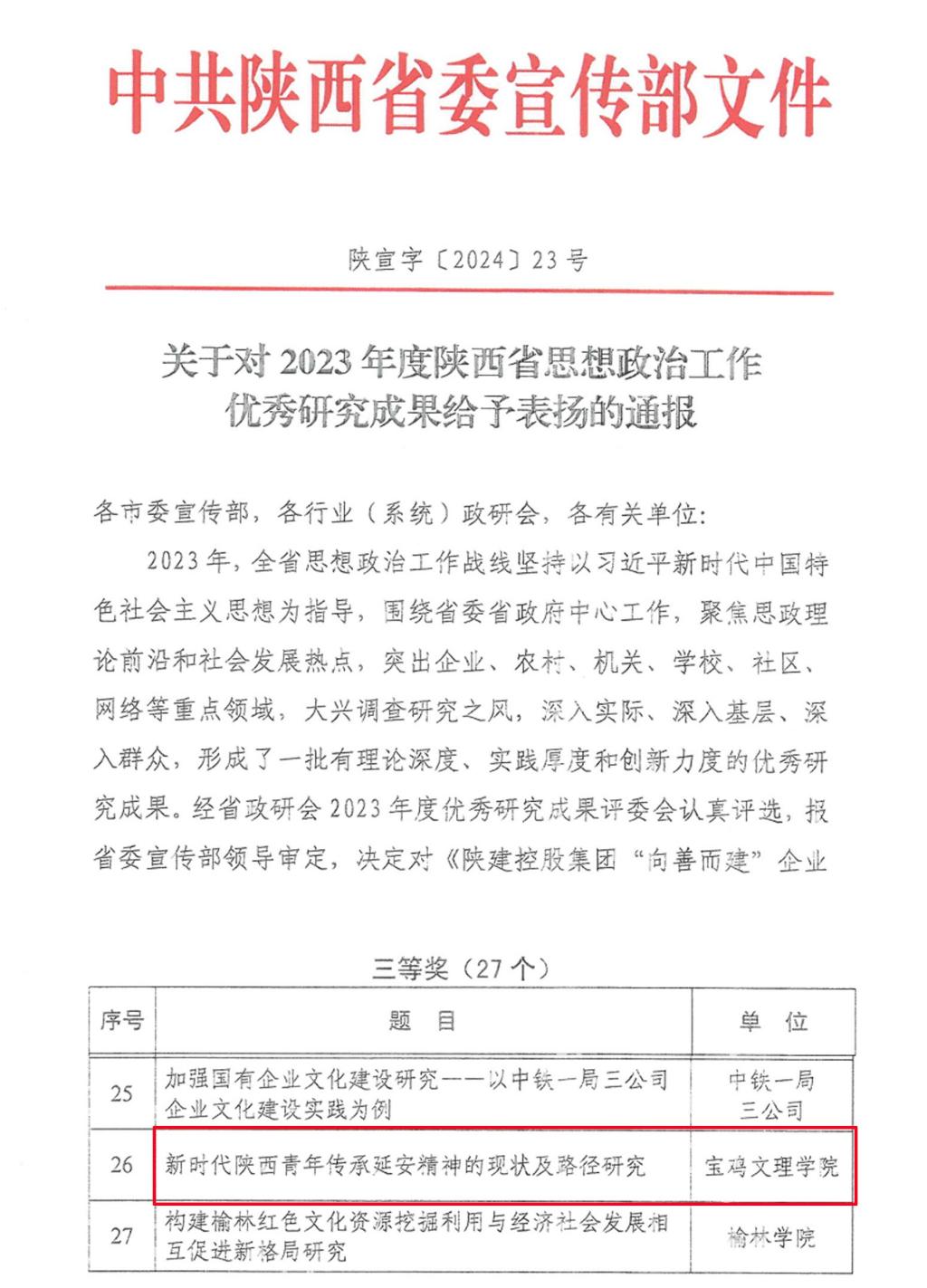 近日,2023年度陕西省思想政治工作研究成果评选结果揭晓,我校马克思主义学院王真教授申报的课题《新时代陕西青年对延安精神的传承现状及路径研究》(课题组成员:刘晓勇、罗玉兰、毛雅宁)获三等奖。