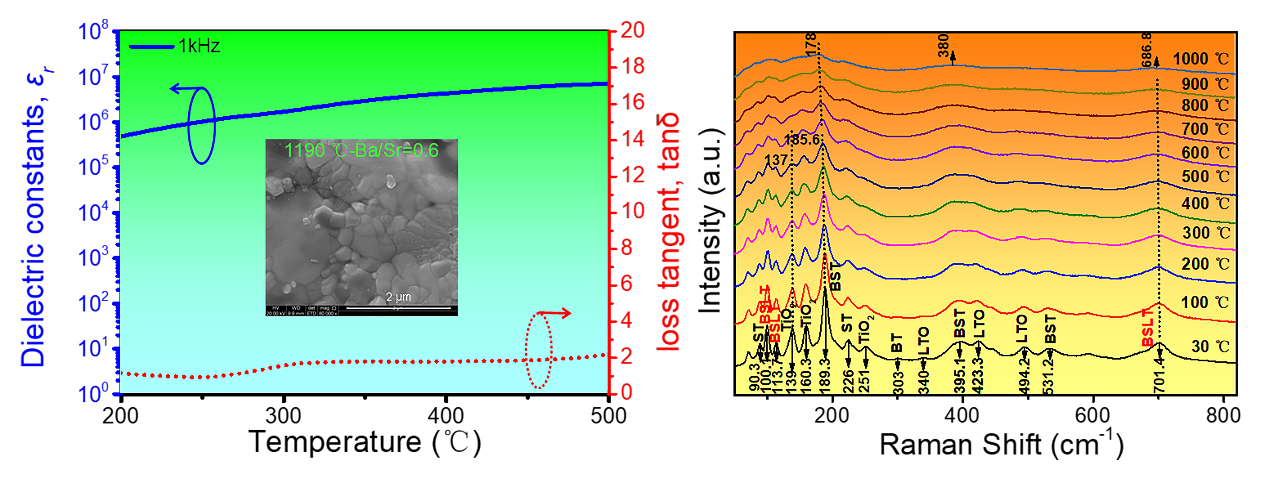BaxSr1-xTiO3(BST)是一种具有高介电常数、低介电损耗、结构稳定、环境友好型等特点的固溶体陶瓷,在介电电容器、通信、传感等领域具有潜在的应用前景。由于BST陶瓷存在烧结温度高、能耗高、高温温度影响大的缺点,本文研究工作以Li2CO3为助熔剂,采用固相反应技术,降低BST陶瓷的烧结温度并改善钙钛矿结构A位环境,制备出了BaxSryLi0.6Ti1.67O3(BSLT)陶瓷。研究了不同Ba/Sr比和烧结温度对BSLT陶瓷微观结构和介电性能的影响。结果表明,当烧结温度为1190 ℃时,Ba0.15Sr0.25Li0.6Ti1.67O3陶瓷在500 ℃、1 kHz下,介电常数为7.11×106,介电损耗为2.2。在相对较高的温度下(200—500℃),BSLT保持相对较高的介电常数(>105)。该研究为高温、高介电性能钛酸钡基陶瓷材料开发提供了新思路。(科研管理处、化学化工学院 文/周妮妮 审核/王晓玲、胡登卫)