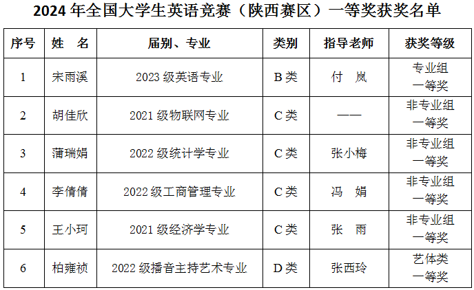 近日,我校学生参加了2024年全国大学生英语竞赛陕西赛区决赛,6名参赛学生分别获一等奖。