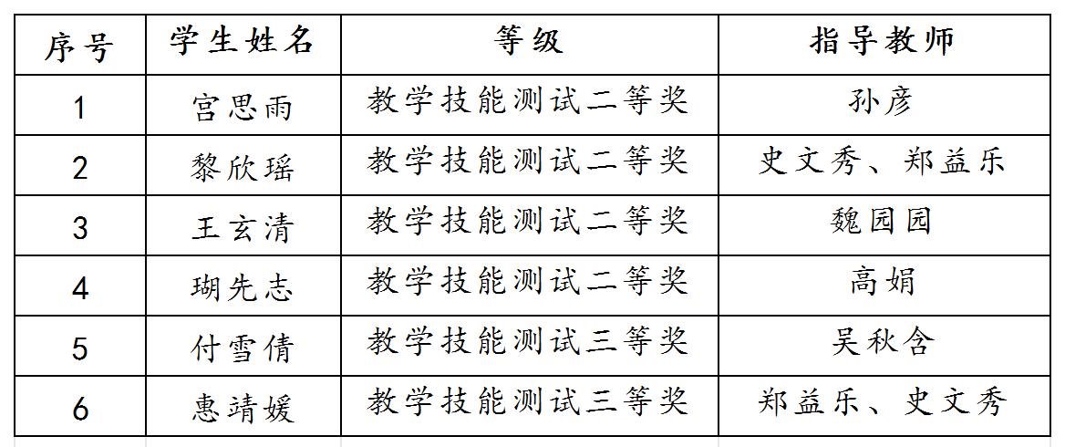 近日,2024年学前教育微格教学论坛暨第十三届高校学前教育师范生教学技能测试与交流展示活动在湖北黄冈落下帷幕,我校学生获二等奖4项、三等奖2项。