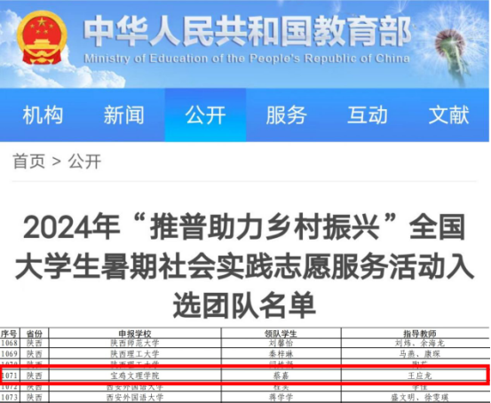 7月2日,教育部公布了2024年“推普助力乡村振兴”全国大学生暑期社会实践志愿服务活动入选团队名单,我校“宝鸡文理学院赴新疆温宿县柯柯牙镇推普助力服务队”成功入选。