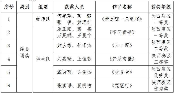 近日,陕西省教育厅办公室公布了第六届中华经典诵写讲大赛(陕西赛区)评选结果,我校在“诵读中国”经典诵读大赛中,教师组获一等奖1项;学生组获一、二、三等奖各1项,优秀奖2项。文学与新闻传播学院教师王应龙、何艳萍获“优秀指导教师”称号。