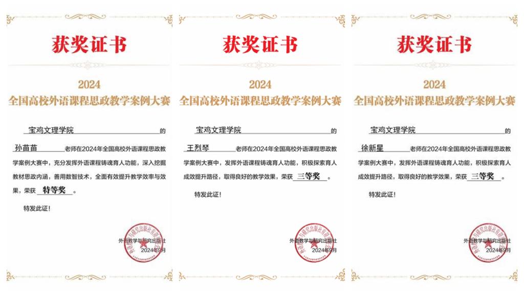近日,由外语教学与研究出版社主办的2024年全国高校外语课程思政教学案例大赛结果揭晓,我校外国语学院教师孙苗苗获主赛道特等奖、王烈琴和徐新星分别在主赛道和“理解当代中国”赛道中获三等奖。