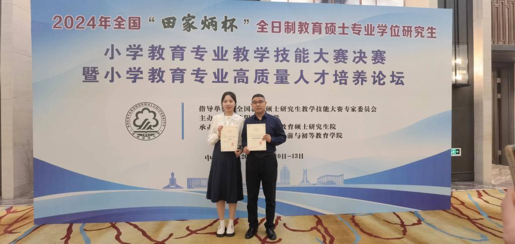 近日,2024年全国“田家炳杯”全日制教育硕士专业学位研究生小学教育专业教学技能大赛决赛暨小学教育专业高质量人才培养论坛在沈阳师范大学举行。我校教育学院2023级小学教育专业研究生薛琛获全国二等奖、李存生获优秀指导教师称号。