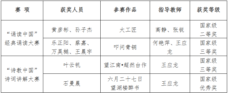 近日,第六届中华经典诵写讲大赛结果公布,我校获“诵读中国”经典诵读大赛二等奖、三等奖各1项,“诗教中国”诗词讲解大赛三等奖、优秀奖各1项。