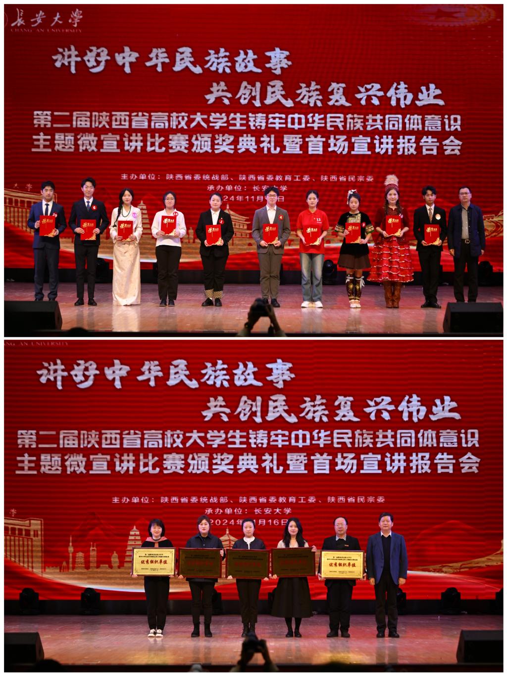 11月16日,由中共陕西省委统战部、陕西省委教育工委、陕西省民族宗教事务委员会联合主办的第二届“陕西省高校大学生铸牢中华民族共同体意识主题微宣讲决赛”在长安大学落幕。我校文学与新闻传播学院2023级播音与主持艺术专业学生王晨宇、王浩安分别获得二等奖,并入选第二届陕西省高校大学生铸牢中华民族共同体意识宣讲团。我校获优秀组织奖。