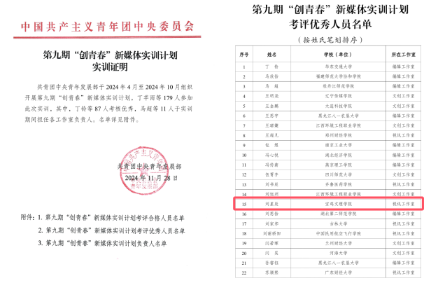 近日,共青团中央青年发展部发布了《第九期“创青春”新媒体实训计划实训证明》,我校文学与新闻传播学院2022级广播电视编导专业学生刘星辰被评为第九期“创青春”新媒体实训计划考评优秀人员。