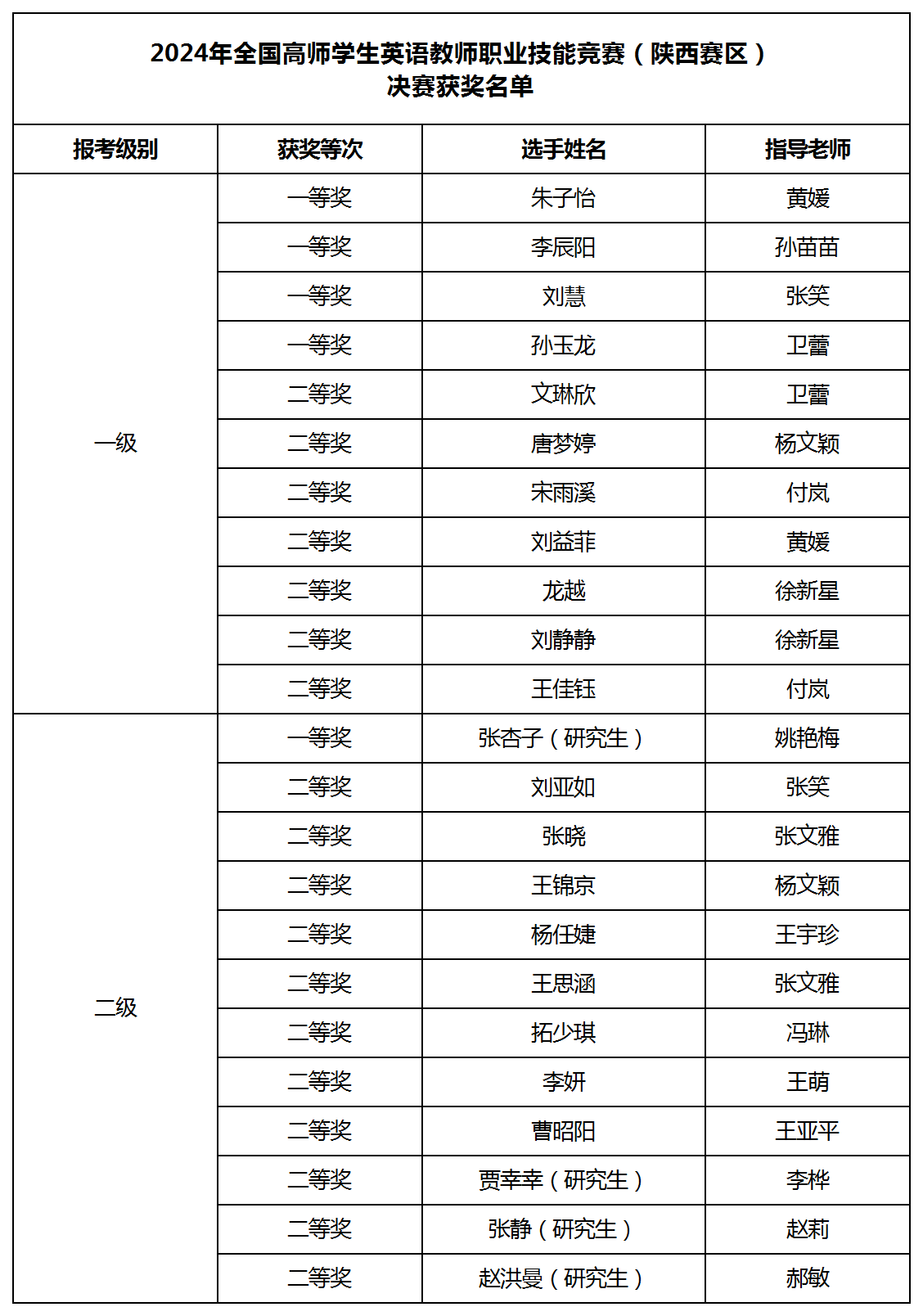 近日,2024年全国高师学生英语教师职业技能竞赛陕西赛区决赛落下帷幕。我校4名学生获得一级一等奖,7名学生获得一级二等奖;1名学生获得二级一等奖,11名学生获得二级二等奖。外国语学院刘敏副教授应邀担任大赛评委,我校连续四年获得该赛事优秀组织奖。