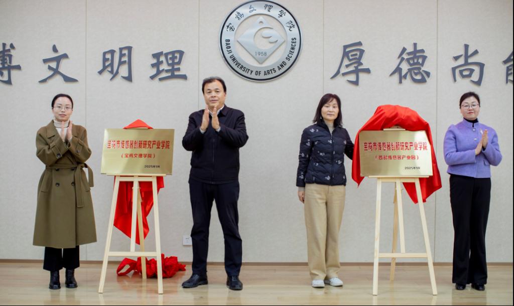 凡明锦和袁瑞为宝鸡市传感器创新研究产业学院(宝鸡文理学院)揭牌;王丽和科研管理处处长王晓玲为宝鸡市传感器创新研究产业学院(西部传感器产业园)揭牌。