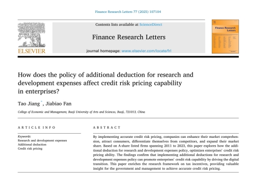 近日,我校经济管理学院姜涛副教授、2024级会计硕士专业学位研究生(MPAcc)范佳标合作撰写的研究论文“How does the policy of additional deduction for research and development expenses affect credit risk pricing capability in enterprises?”在SSCI一区期刊Finance Research Letters上发表。该期刊为中科院SSCI经济学大类TOP期刊,在JCR学科类别的Business/Finance中排名第7(7/233)位,2025年影响因子7.4。