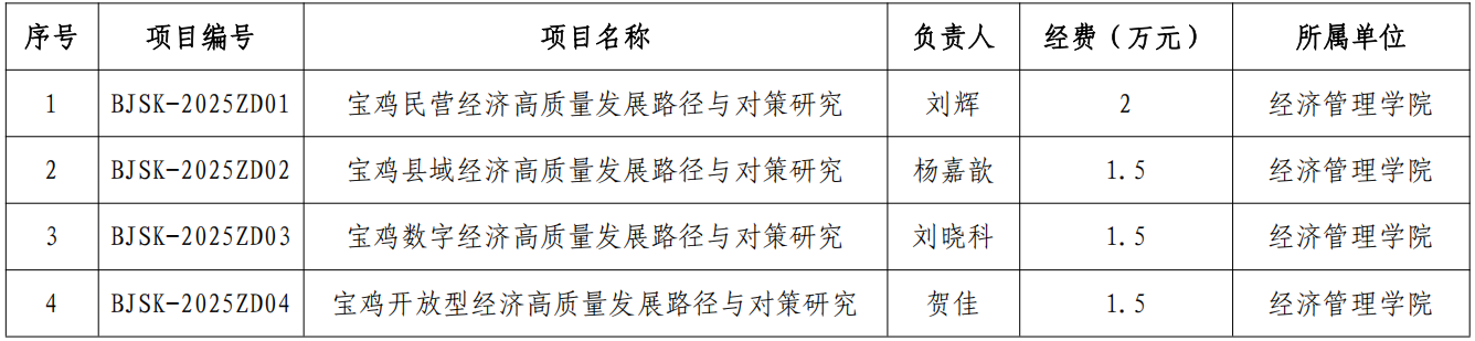 近日,宝鸡市社会科学界联合会公布了宝鸡市“县域经济、民营经济、开放型经济、数字经济”重点课题立项结果,我校获批4项,经费合计6.5万元。(科研管理处 文/张蕴 审核/王晓玲)