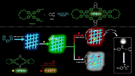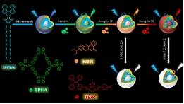 发表在Dyes and Pigments上的研究论文“Three-stepsequential artificial light-harvesting systems constructed by tetraphenylethylene macrocycle-based supramolecular cascade assembly in waterfor tunable photoluminescence”第一作者为我校硕士研究生邹莉和苏小龙博士,通讯作者为冯海涛教授,我校为第一完成单位和通讯单位。该期刊为中科院一区,影响因子4.1。该工作主要是利用四苯乙烯硫脲大环化合物TPEA通过超分子级联自主装策略成功构建了三次能量传递的水相人工光捕获体系。四苯乙烯(TPE)大环作为能量受体通过共组装包覆在能量供体的纳米结构表面,TPE分子内旋转进一步被抑制,使TPE大环的AIE效应进一步被增强,可以有效解决供体与受体分子较高比例定向靠近发生ACQ的问题。最后将光捕获体系的纳米颗粒涂在LED器件表面可以实现颜色可调的光致发光。因此,基于超分子组装策略使大环AIEgen成为构建高效有机发光的理想材料。