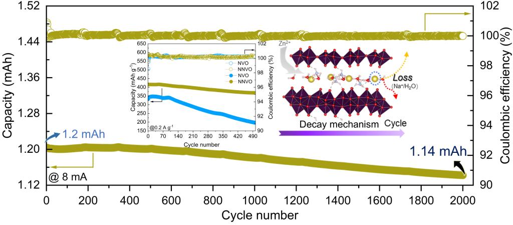 水系锌离子电池具有本征安全、成本低、环境友好等优点,是大规模电站储能的新选择。目前,高容量(>400 mAh/g)、稳定(>500圈)的正极材料仍然是一个重大挑战,制约了水系锌离子电池的发展。本文采用顺序水热法制备了一种新型杂化三元共插层的钒氧化物正极Nax(NH4)2−xV10O25·8H2O。该材料中H2O、NH4+和Na+的三元共嵌入可以扩大钒氧化物层间距,同时促进Zn2+存储活性位点、晶格结构稳定性和Zn2+迁移能力,使该材料在0.1 A/g电流密度下表现出481.2 mAh/g的比容量,且在2.0 A/g电流密度下的2000次循环容量保持率达到95%,具有良好的实用价值。此外,该工作还揭示了嵌入元素损失主导的容量衰减机制,为提高层间可调正极材料的容量和稳定性提供了一种可行的共插层策略和调控方法。(科研管理处、物理与光电技术学院 文、图/董宇 审核/胡登卫、钱郁)