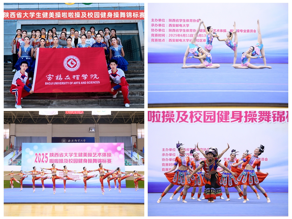 6月10日至12日,我校大学生参加了陕西省大学生健美操艺术体操啦啦操及校园健身操舞锦标赛,获第一名3项、第二名2项、第三名2项、第四名2项、第五名1项,并获得最佳团队奖。
