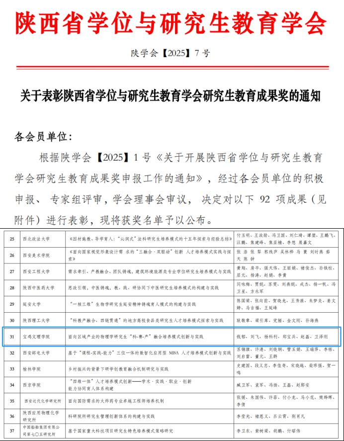 近日,陕西省学位与研究生教育学会发布《关于表彰陕西省学位与研究生教育学会研究生教育成果奖的通知》(陕学会〔2025〕7号),我校物理与光电技术学院钱郁教授主持的《面向区域产业的物理学研究生“科-赛-产”融合培养模式创新与实践》研究生教育成果荣获二等奖。