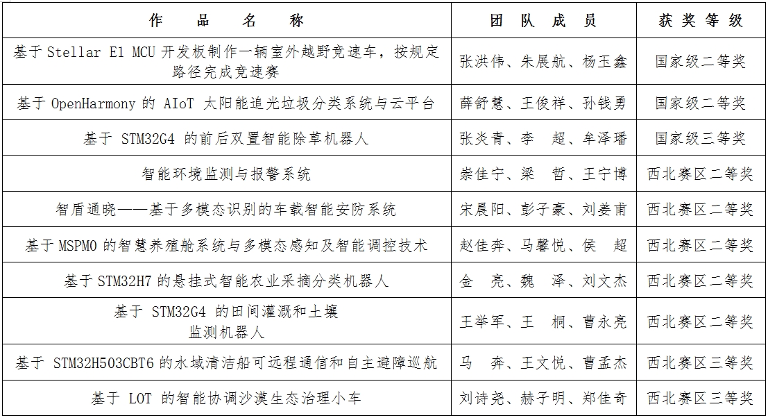 近日,2025年全国大学生嵌入式芯片与系统竞赛结果正式公布。我校选拔的19支参赛队伍凭借扎实的专业能力与出色的实践表现获全国二等奖2项、三等奖1项,西北赛区二等奖5项、三等奖2项。