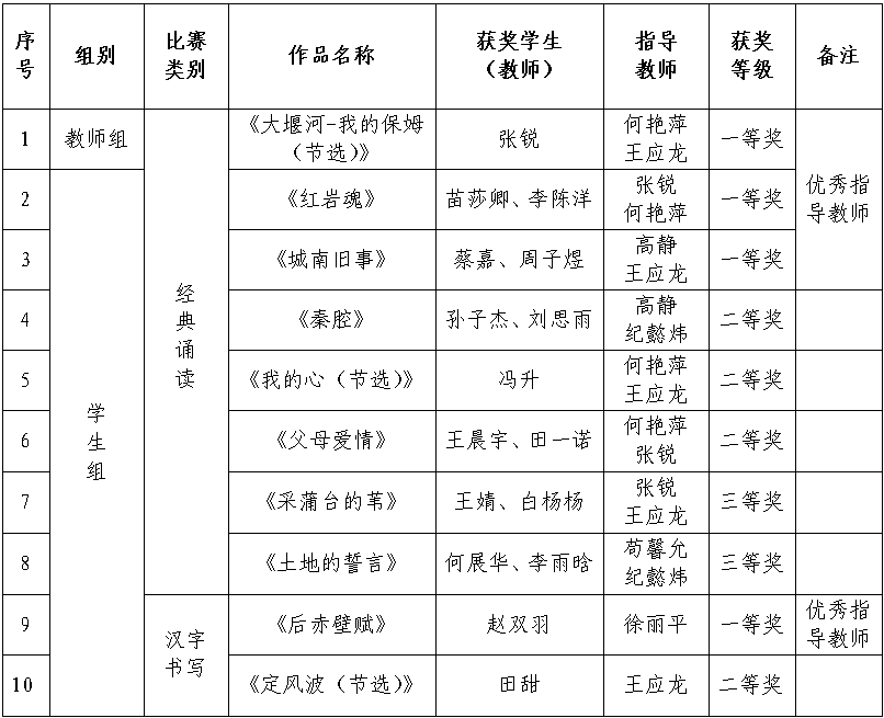 近日,陕西省教育厅办公室公布了第七届“诵读中国”经典诵读大赛和“笔墨中国”汉字书写大赛(陕西赛区)评选结果,我校取得优异成绩。在经典诵读大赛中,我校教师获一等奖1项,学生获一等奖2项、二等奖3项、三等奖2项;在汉字书写大赛中,我校学生获得一等奖1项,二等奖1项。王应龙、何艳萍、高静、张锐、徐丽平五位老师获“优秀指导教师”称号。