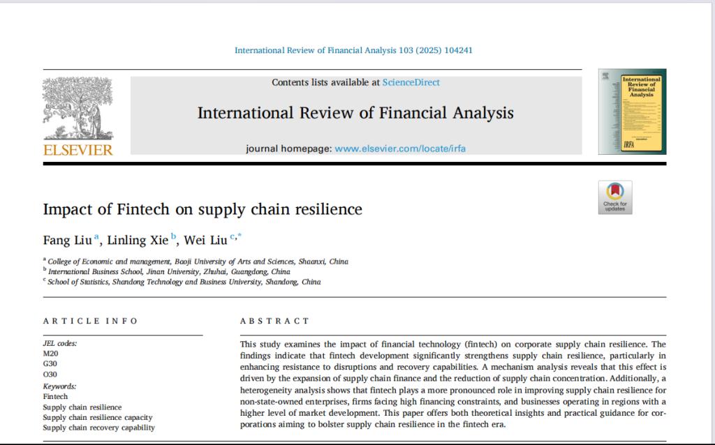近日,我校经济管理学院刘芳副教授团队研究成果“The Impact of Fintech on Supply Chain Resilience”发表在国际知名期刊International Review ofFinancial Analysis上。该期刊被SSCI收录,属于JCR一区、中科院二区Top期刊,最新影响因子9.8,在商业金融期刊领域世界排名第4位,是澳大利亚商学院院长理事会(ABDC)评级A类期刊和英国商学院协会(ABS)评级3星期刊。刘芳副教授为第一作者,我校为第一完成单位。