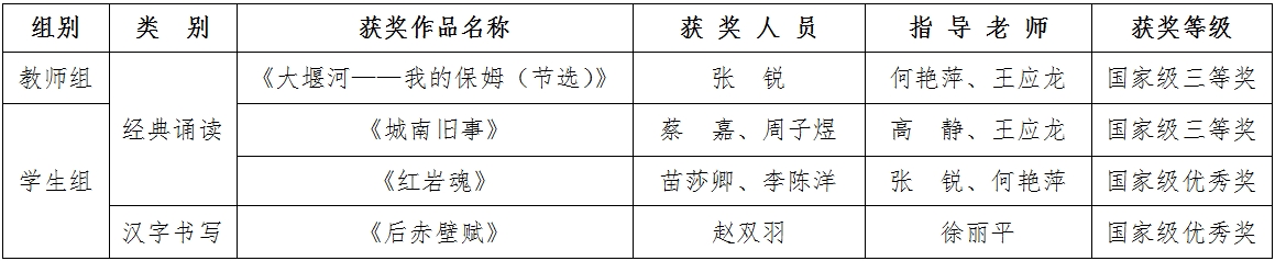 近日,由教育部、国家语委主办的第七届中华经典诵写讲大赛评审结果揭晓,我校获“诵读中国”经典诵读大赛三等奖2项、优秀奖1项,“笔墨中国”汉字书写大赛优秀奖1项。