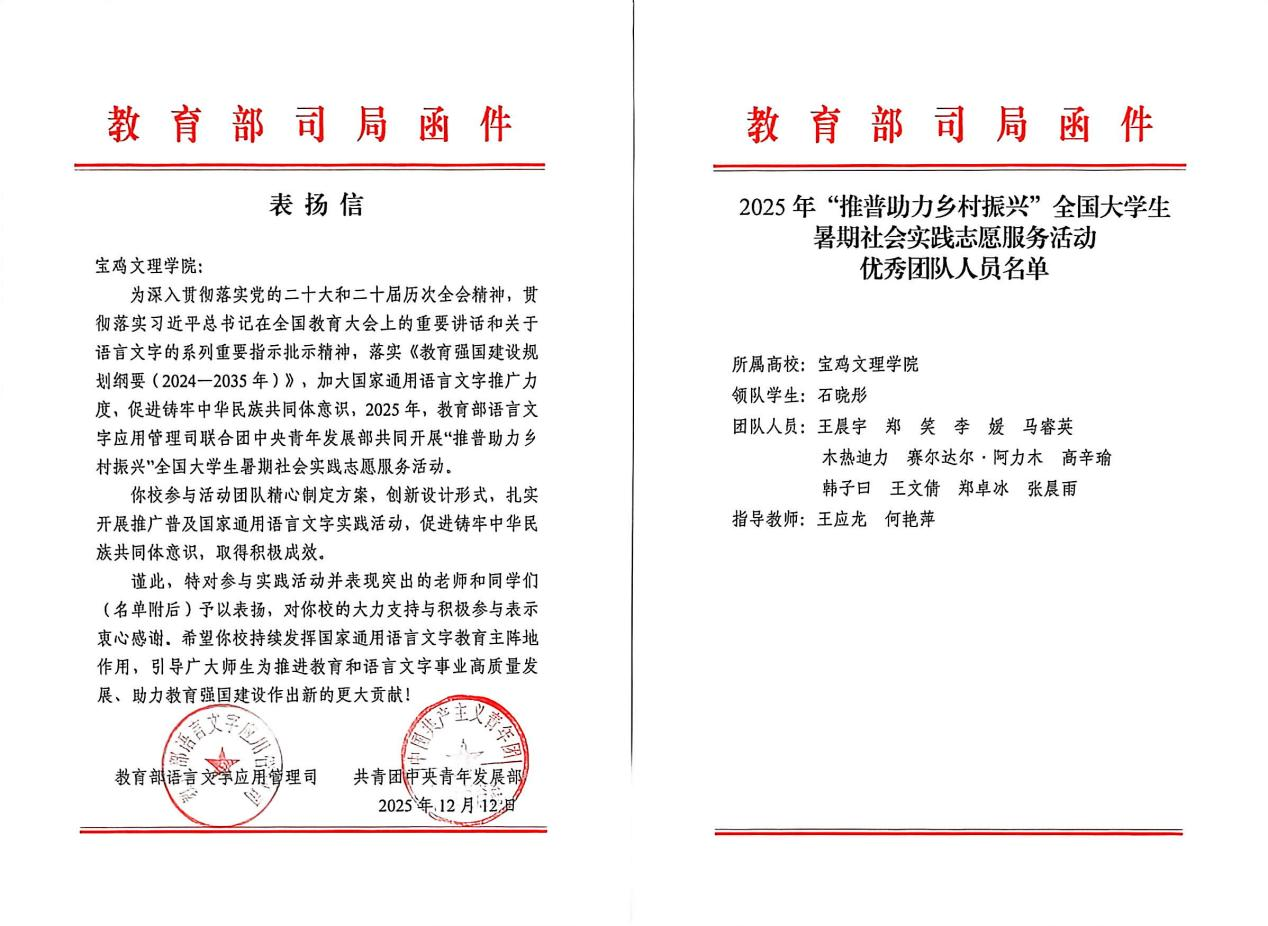 近日,由教育部语言文字应用管理司、共青团中央青年发展部联合开展的2025年“推普助力乡村振兴”全国大学生暑期社会实践志愿服务活动评选结果揭晓,我校推普团队获“优秀团队”荣誉称号并受到来信表扬。