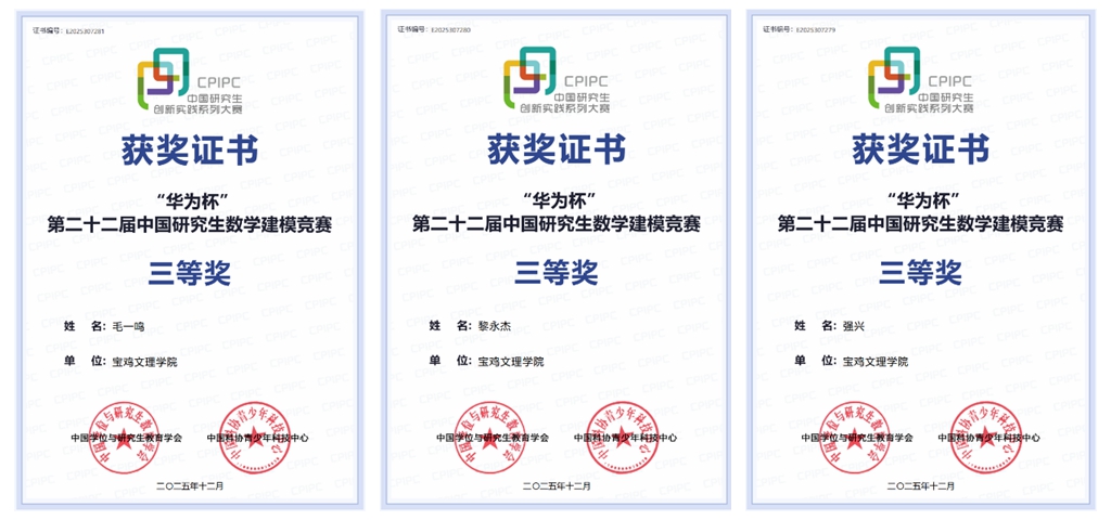 近日,“华为杯”第二十二届中国研究生数学建模竞赛获奖结果正式公布。我校数学与信息科学学院2024级硕士研究生毛一鸣、黎永杰、强兴组成的参赛团队,凭借扎实的数学建模能力、高效的团队协作与创新的问题解决思路脱颖而出,获国赛三等奖。李艳颖教授为该团队的指导教师。