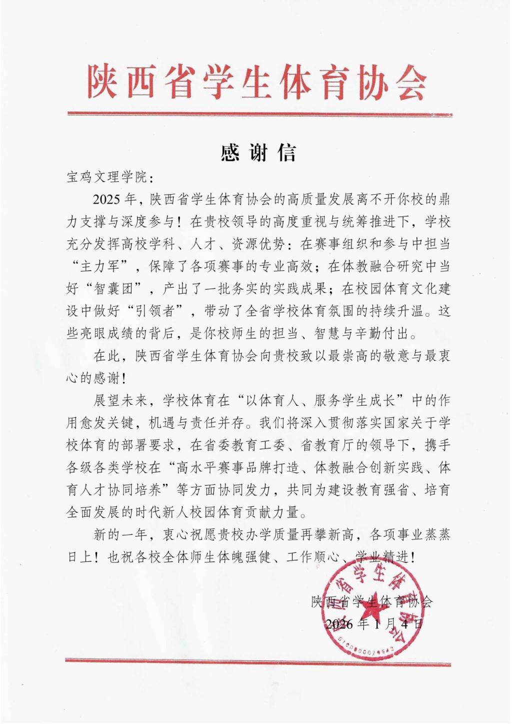 近日,学校收到陕西省学生体育协会发来的感谢信。信中,协会对我校在体育赛事参与、体教融合实践及校园体育文化建设等方面的工作给予充分认可,学校立足体育育人根本,既实现了高水平竞技体育的突破,又深耕普及性体育活动,为陕西学校体育事业发展树立了良好典范。