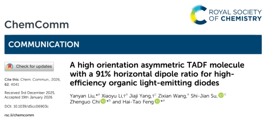 刘艳艳博士另一研究成果“High Orientation Asymmetric TADF Molecule with 91% Horizontal Dipole Ratio for High-Efficiency Organic Light-Emitting Diodes”发表在国际著名期刊Chemical Communications上(影响因子4.2,SCI二区)。该工作中设计合成的新型不对称TADF分子TDCN,兼具刚性结构和优异的光物理性能。该分子在掺杂薄膜中表现出80%的光致发光量子产率和高达91%的水平偶极取向,显著提升了器件的光输出效率。基于该材料的黄光OLED器件实现了26.4%的最大外量子效率、86.1cd/A的电流效率和76.7lm/W的功率效率,展现出优异的综合性能。该研究为高效TADF-OLED的材料设计提供了新思路,特别是在分子取向调控和激子利用效率方面具有重要意义。刘艳艳博士为论文第一作者,冯海涛教授和五邑大学池振国教授为论文通讯作者,我校为第一完成单位和通讯单位。