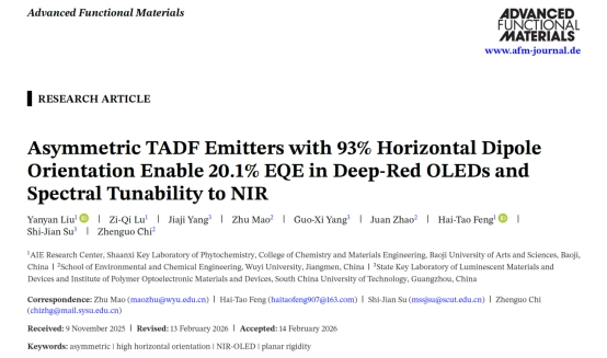 近日,我校化学与材料工程学院、宝鸡市新型聚集诱导发光材料工程技术研究中心在国际著名TOP期刊Advanced Functional Materials(影响因子19.0,SCI一区TOP)发表题为“Asymmetric TADF Emitters with 93% Horizontal Dipole Orientation Enable 20.1% EQE in Deep-Red OLEDs and Spectral Tunability to NIR”的研究论文,该研究中设计并合成了两种具有刚性结构和高度取向的非对称近红外分子DTN和ATN。采用DTN或ATN作为发光层材料,优化器件结构成功制备了高效近红外OLED。该研究为开发高效、可调谐的近红外有机发光材料提供了新的分子设计策略。论文第一作者为我校AIE研究中心青年教师刘艳艳博士、研究生鲁子祺以及华南理工大学研究生杨佳吉,通讯作者为冯海涛教授、五邑大学池振国教授、毛竹副研究员以及华南理工大学苏仕健教授,我校为第一完成单位和通讯单位。